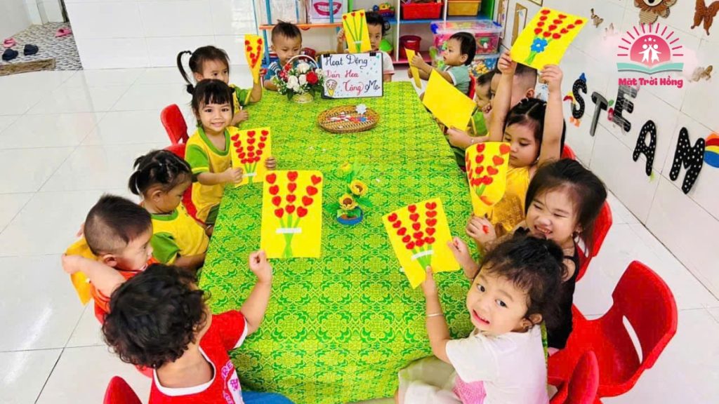 Yêu Thương Con Gửi Trọn Qua Bàn Tay Nhỏ: Hoạt Động “Dán Hoa Tặng Mẹ” Tại Mầm non Mặt Trời Hồng 🌸